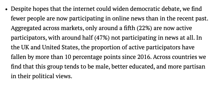 Per i meno anglofoni: «nonostante le speranze» che internet avrebbe allargato la dialettica democratica, sempre meno persone risultano essere parte dei discorsi alimentati dal ciclo delle notizie online. Solo un quinto del totale è considerabile un partecipante attivo al discorso pubblico social-mediato, e addirittura il 47% non vi partecipa affatto.